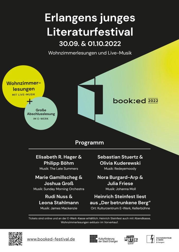 Mit fünf Wohnzimmerlesungen samt Hauskonzerten und einer großen Abschlussveranstaltung im E-Werk geht unser Literaturfestival book:ed weiter, für das ich auch 2022 wieder die Autor:innen auswählen und einladen durfte.