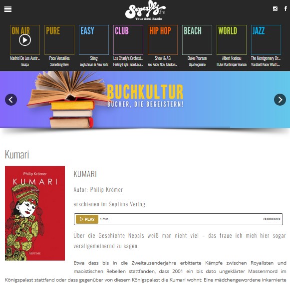 Katia Schwingshandl empfiehlt meinen Roman »Kumari« als Buchkultur-Tipp auf Superfly.fm.