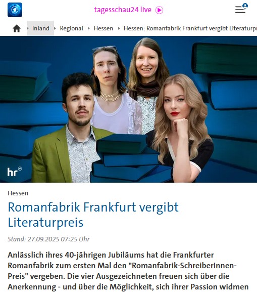 Nach Platzierungen auf der Long- und Shortlist wurde meine Erzählung »Langer Johann« nun mit einem der vier Romanfabrik-SchreiberInnen-Preise 2025 ausgezeichnet. Ich freue mich sehr über die Auszeichnung und die damit verbundene Schreibresidenz 2026 in Frankfurt.
