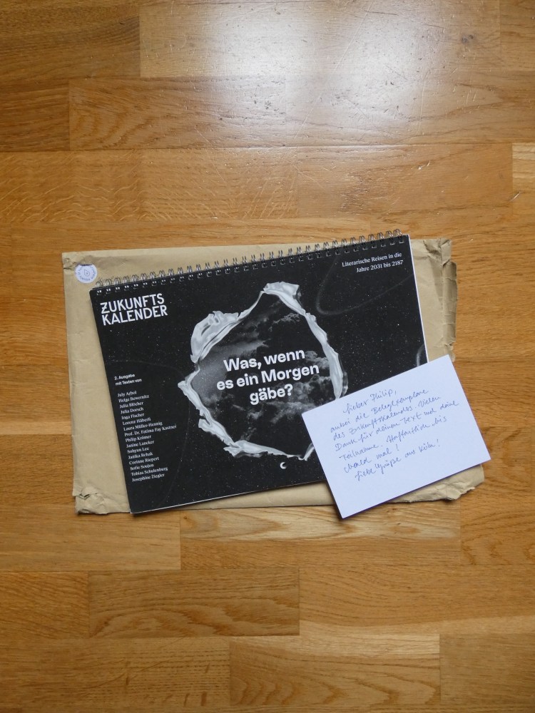 Was, wenn es ein Morgen gäbe? 14 Geschichten und Gedichte von 14 jungen Autor:innen über mögliche Zukünfte. Gedankenexperimente und Ausflüge. Darunter meiner ins Jahr 2077 über eine Wünsche erfüllende Gott-KI und die Rückkehr der Raumsonde Voyager, betitelt In meinem Stundenglas rinnen Sterne. Zukunftskalender #2, out now als literarischer Wandkalender.