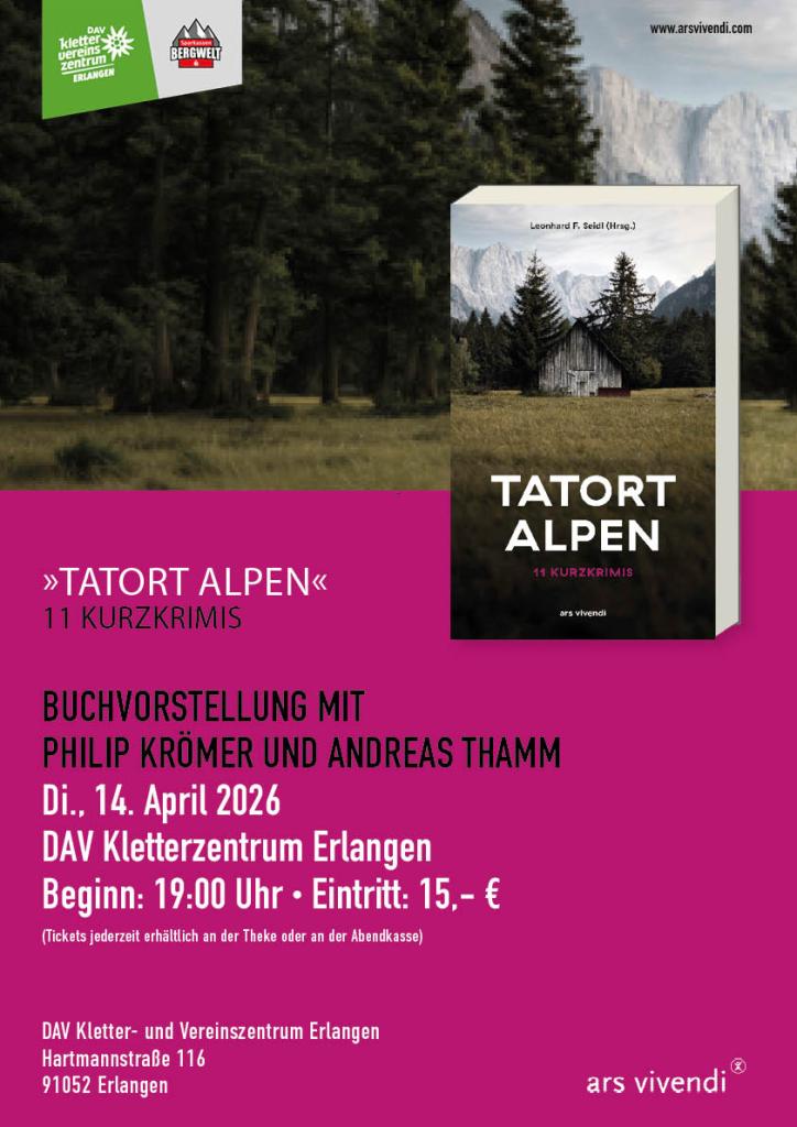 [lesung] Tatort Alpen Verfasst vonphilipkroemer13. April 2026Veröffentlicht in[lesung]Schlagwörter:Erzählung Morgen darf ich kurzfristig einspringen und in Erlangen zusammen mit Andreas Thamm unsere Kurzkrimis aus der Anthologie Tatort Alpen vorstellen. WANN? – Dienstag, 14.04., 19 UhrWO? – DAV Kletterzentrum, Hartmannstraße 116, 91052 Erlangen Homepage Gefällt mir Wird geladen …